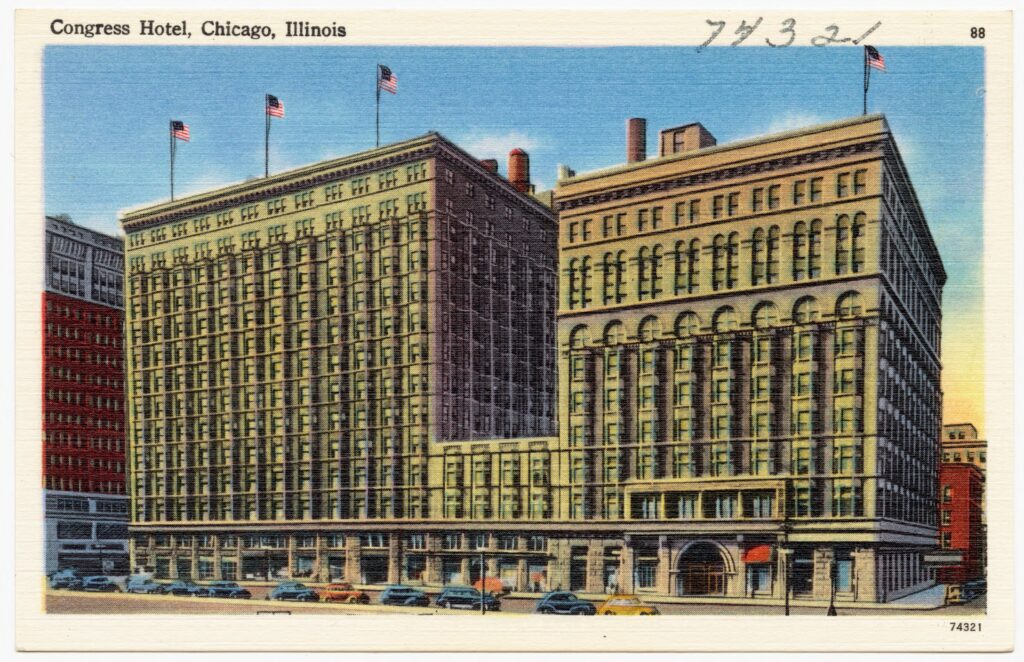 The Congress Plaza started life as the Auditorium Annex in 1893, built for the Worldโs Columbian Exposition era (think of it as the World’s Fair). It was part of the campus to show Chicago had returned from the Great Fire that left the city burned to the ground. Over time, it expanded, changed names, and became one of those Chicago historic buildings thatโs basically seen everything. Including (possibly) serial killers … but that’s a tale for another day. (Congress Plaza Hotel)